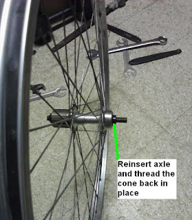 Now carefully slide the axle back in place and secure it with the cone that you removed earlier. Just hand tighten it, it's ok to leave some play in the axle for now.